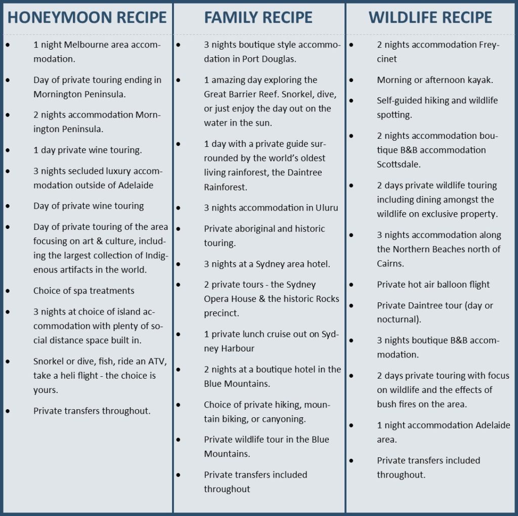 COVID-19 UPDATE: We continue to look to the future and are available for your future travel needs to and within Australia. Why wait for the actual restrictions to be lifted – we’re already thinking of some trips we would personally want to take in Australia & we’d like to share some of those ideas with as you start to think about future travel for yourself and/or your clients. These trips pay special attention to social distancing. Choose your recipe and, as any good recipe, we will tweak to your preferred tastes.